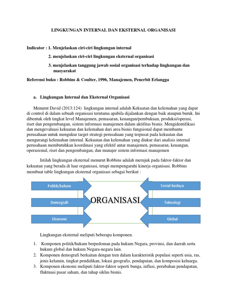 Tugas etika bisnis bisnis dan lingkungan internal dan eksternal disusun oleh: Pengaruh lingkungan bisnis eksternal, formulasi strategi, dan pengendalian intern terhadap kinerja perusahaan (survei pada pt bpr/bkk milik pemerintah dan swasta di wilayah kabupaten banyumas dan purbalingga) dr. Diketahui jenis organisasi sangatlah beragam apalagi organisasi yang berada pada tingkatan yang lebih spesifik pun ada.